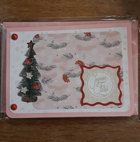 En couverture, un papier flocons de neige et branches de houx pailletés, découpe d'un sapin, cabochons rouges. Etiquette Joyeuses Fêtes