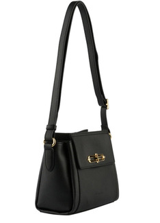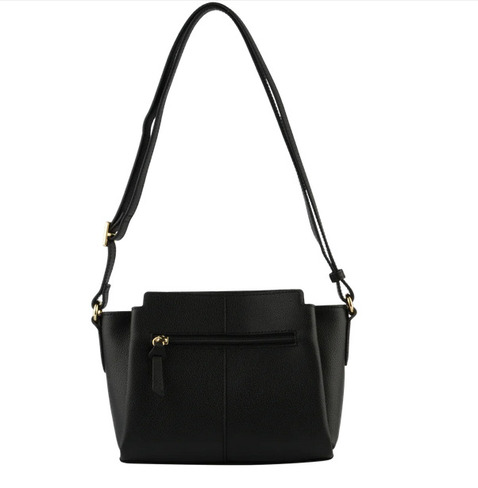 Trois compartiments, la partie principale zippée et les deux autres fermée par pression. Une poche avant et une seconde à l'arrière zippée. C'est certain que vous ne manquerez pas de poche avec ce petit sac.